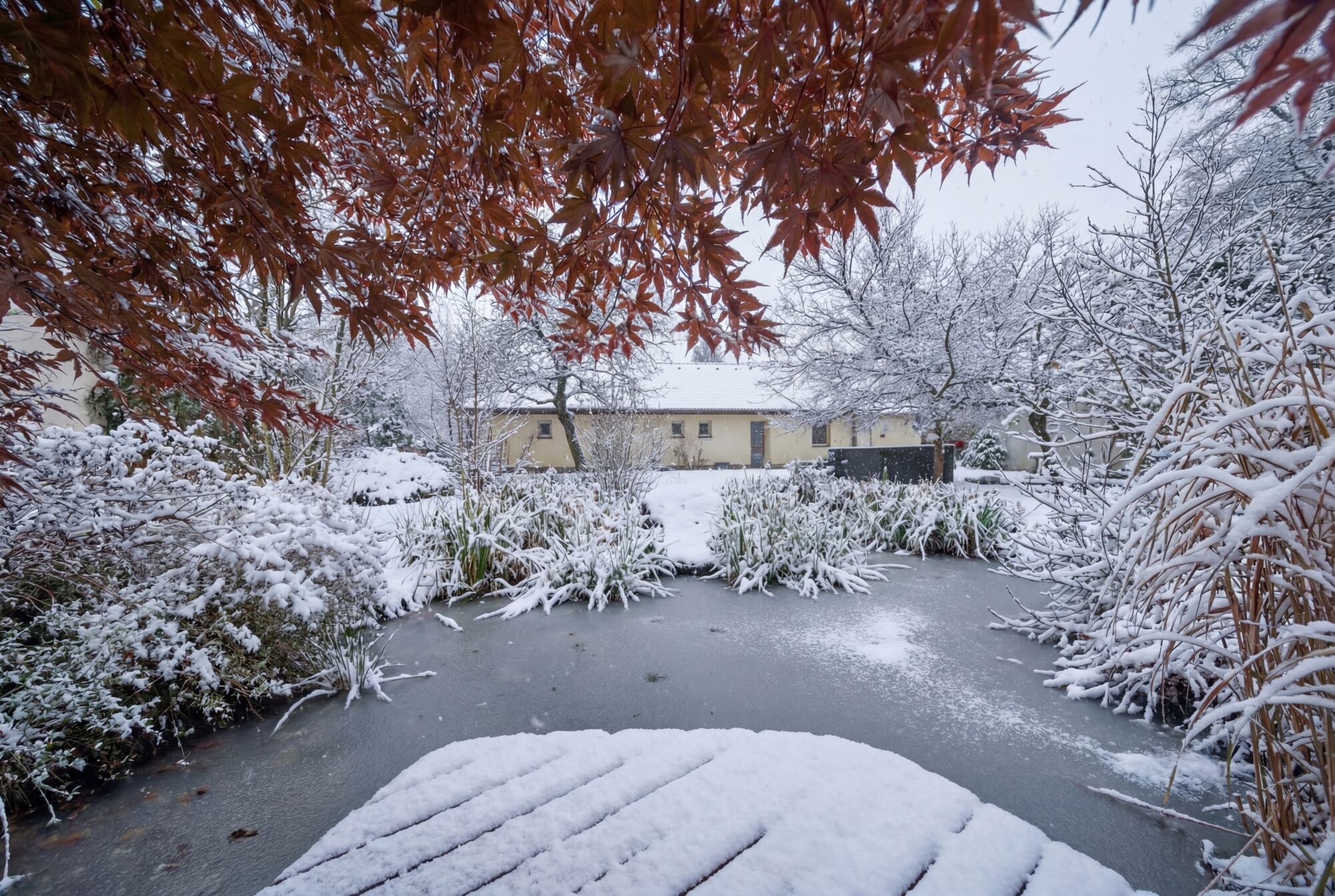 Najdete tu vzrostlé stromy, zákoutí s posezením, pečlivě založené záhony, ale také altán pro letní večery, jezírko, které dotváří atmosféru klidu, a hrubou stavbu bazénu, kterou si můžete dokončit přesně podle svých představ – ať už jako relaxační wellness zónu, místo pro sport, nebo jako další budovu pro setkávání v rámci firmy, porádání seminářů.