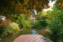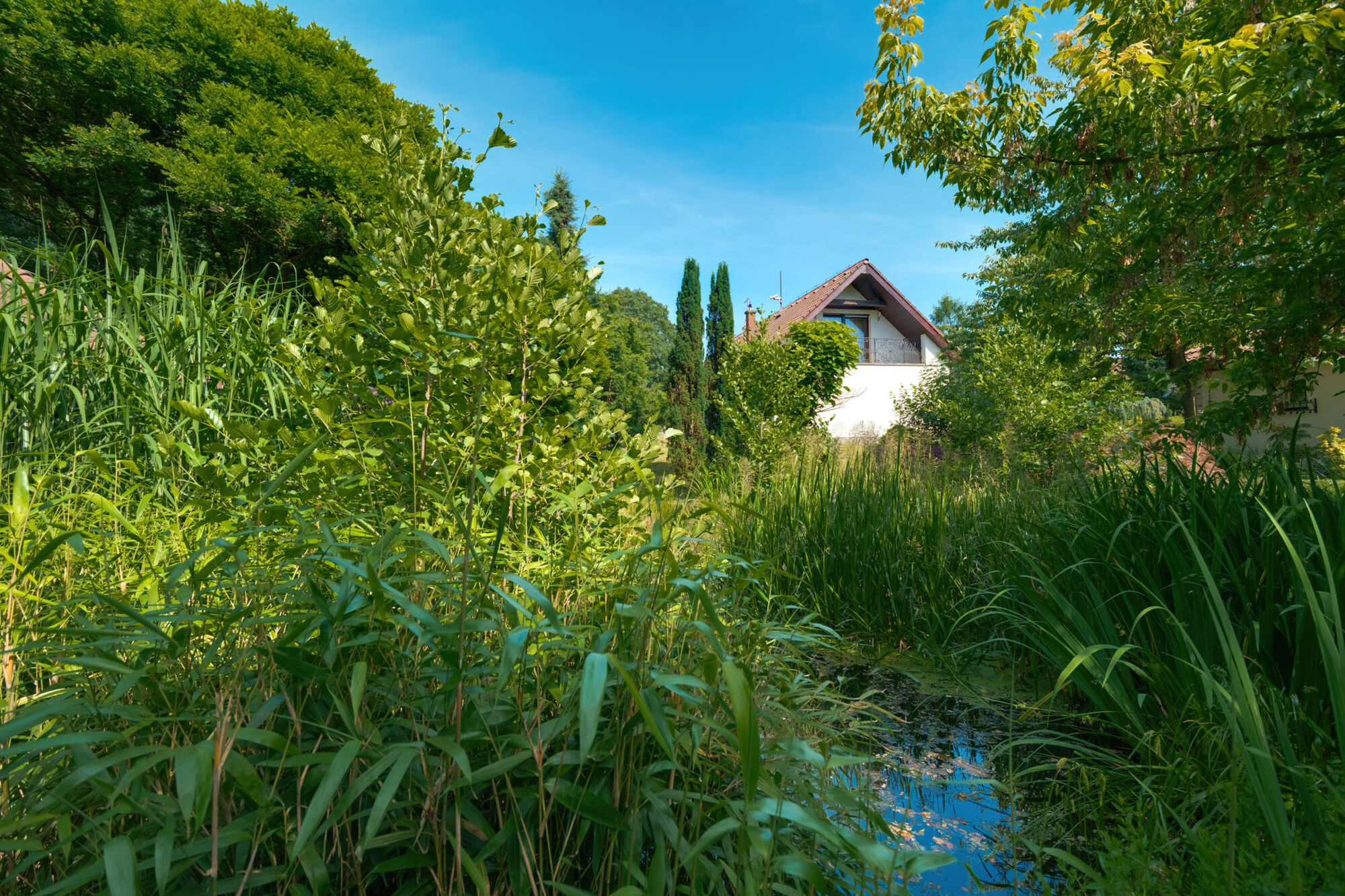 Najdete tu vzrostlé stromy, zákoutí s posezením, pečlivě založené záhony, ale také altán pro letní večery, jezírko, které dotváří atmosféru klidu, a hrubou stavbu bazénu, kterou si můžete dokončit přesně podle svých představ ať už jako relaxační wellness zónu, místo pro sport, nebo jako další budovu pro setkávání v rámci firmy, porádání seminářů.