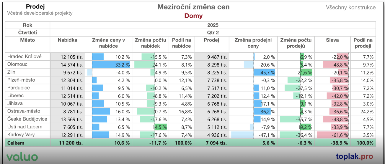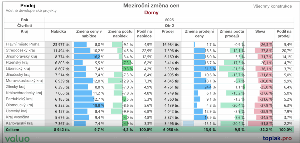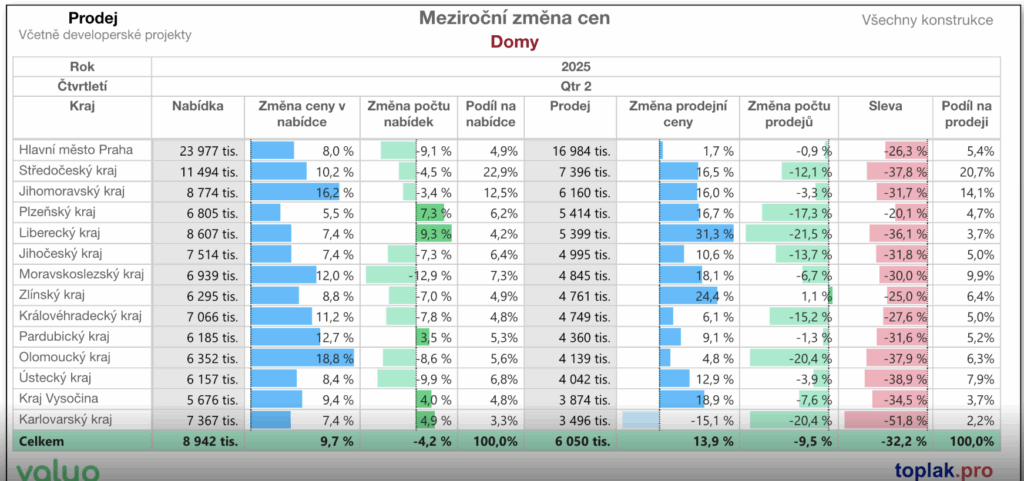 U rodinných domů je tento rozdíl ještě větší – prodávající často musí slevit až o 25–30 %, aby se dostali na reálnou tržní úroveň.